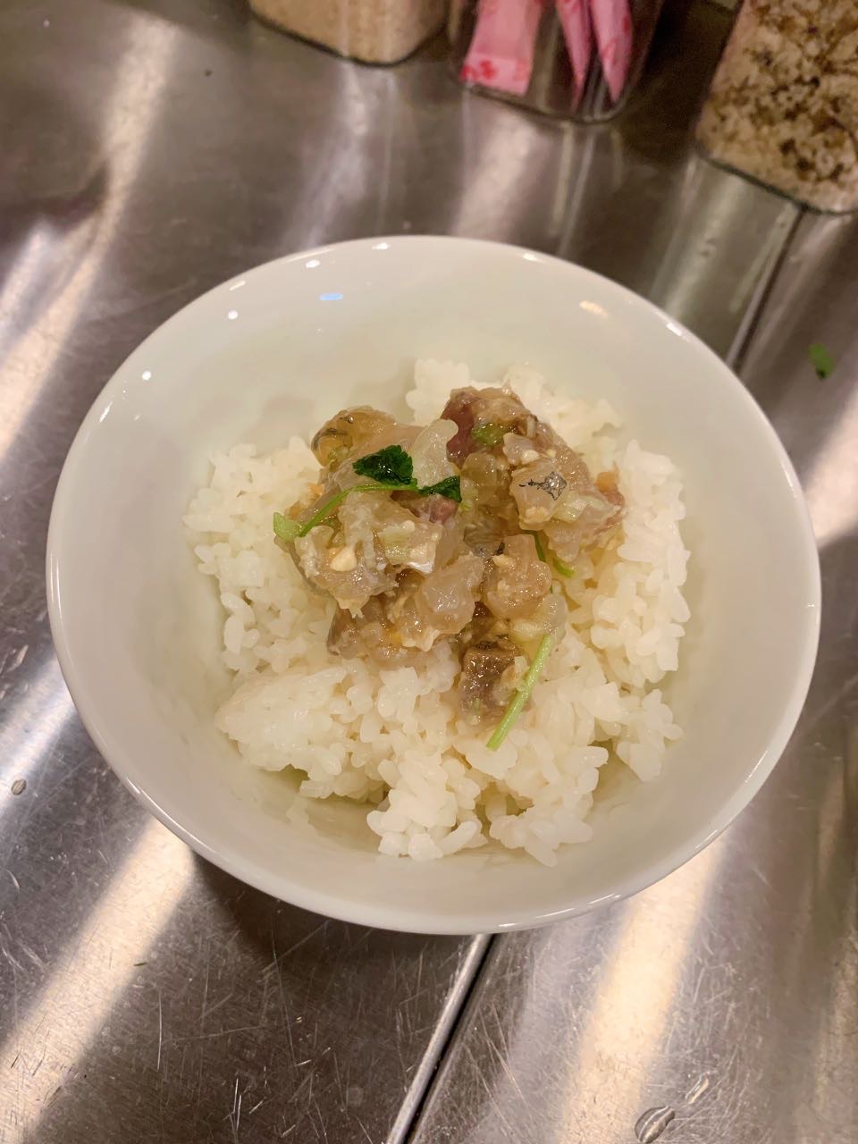 残り物のなめろうに、出汁かけてお茶漬けに