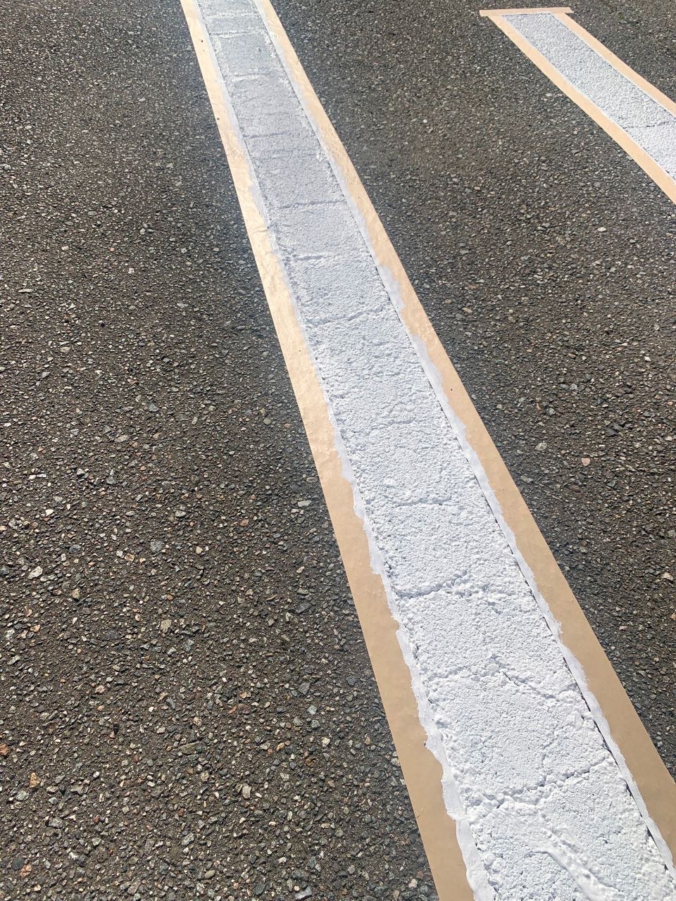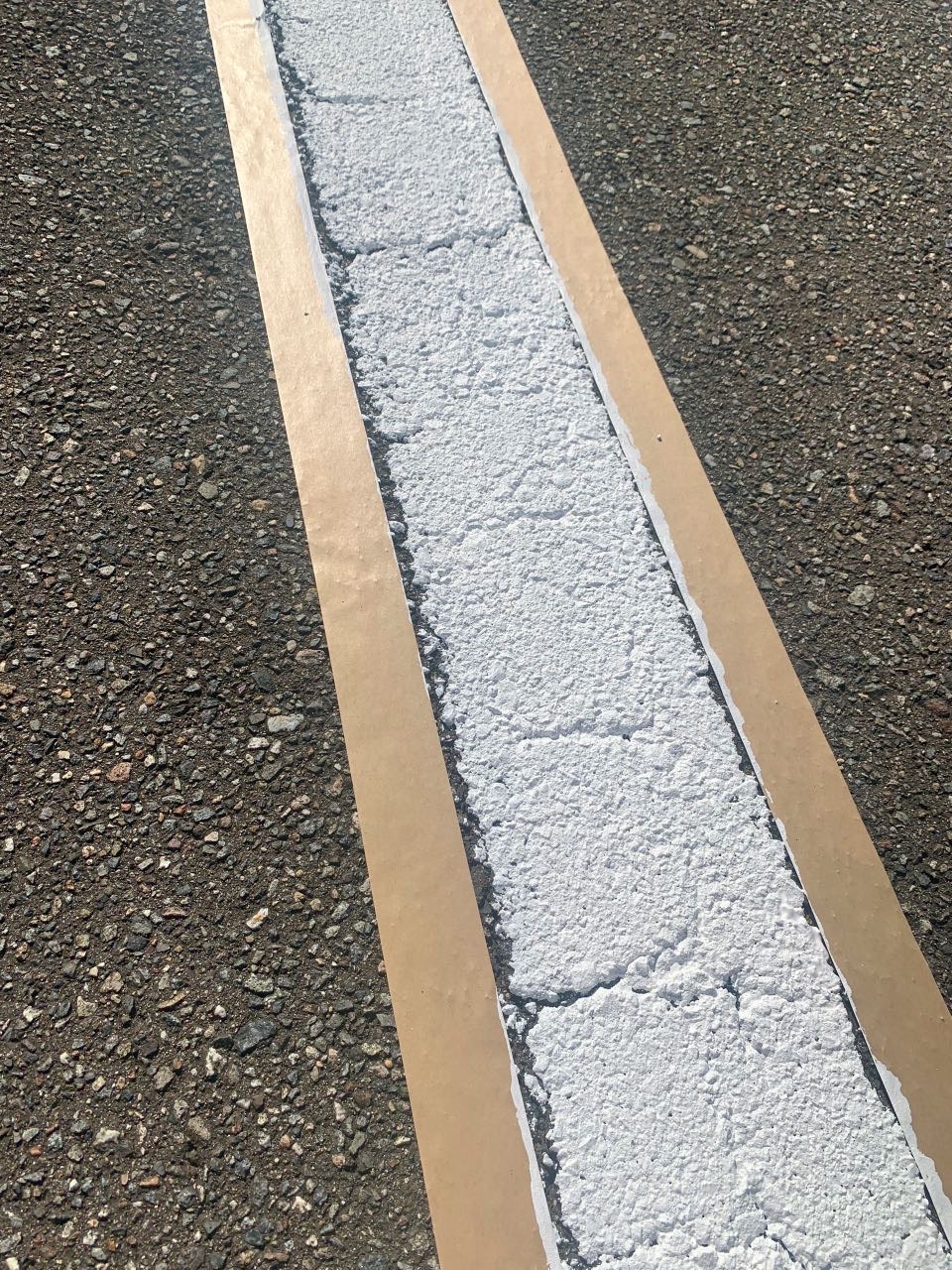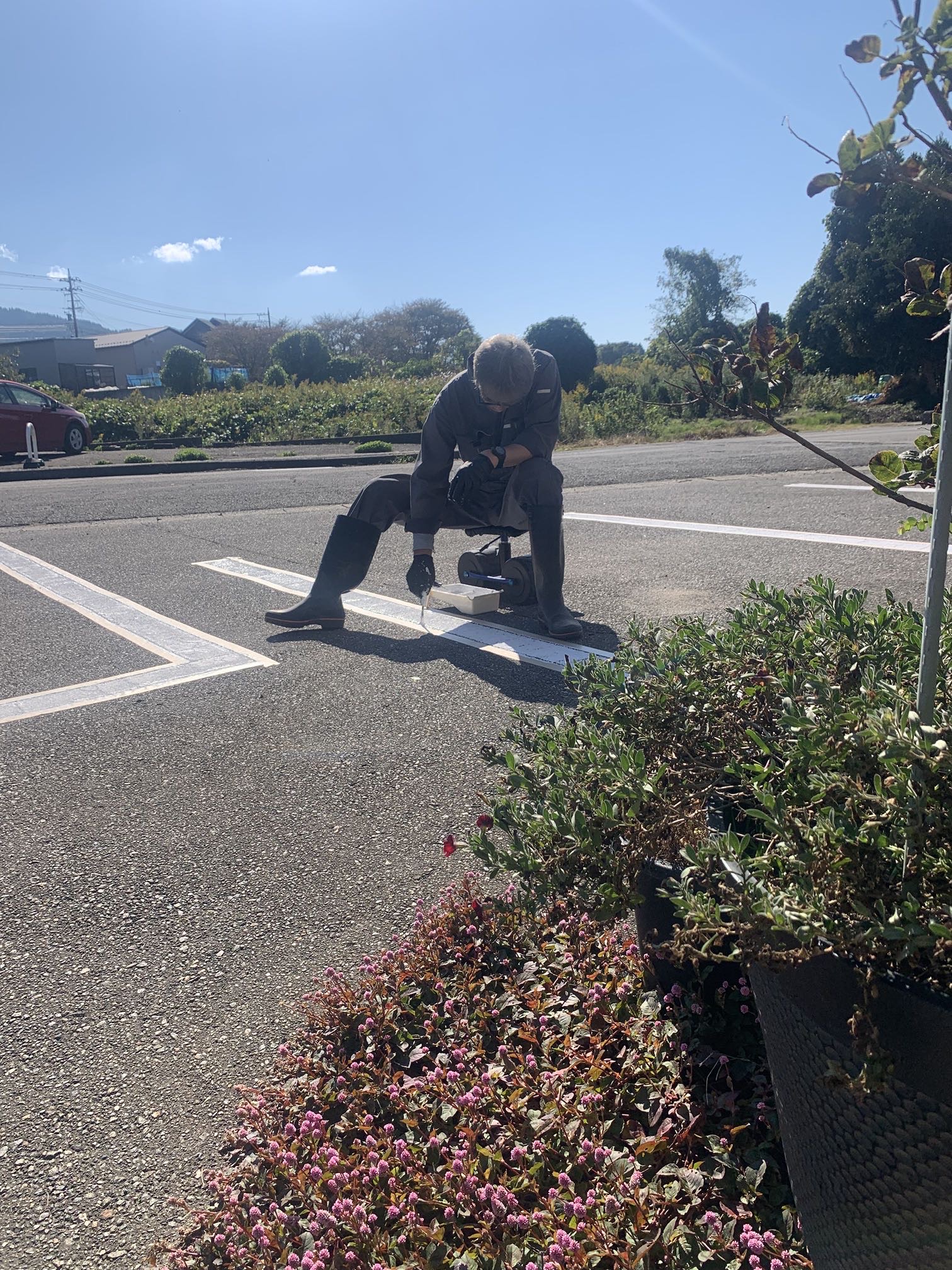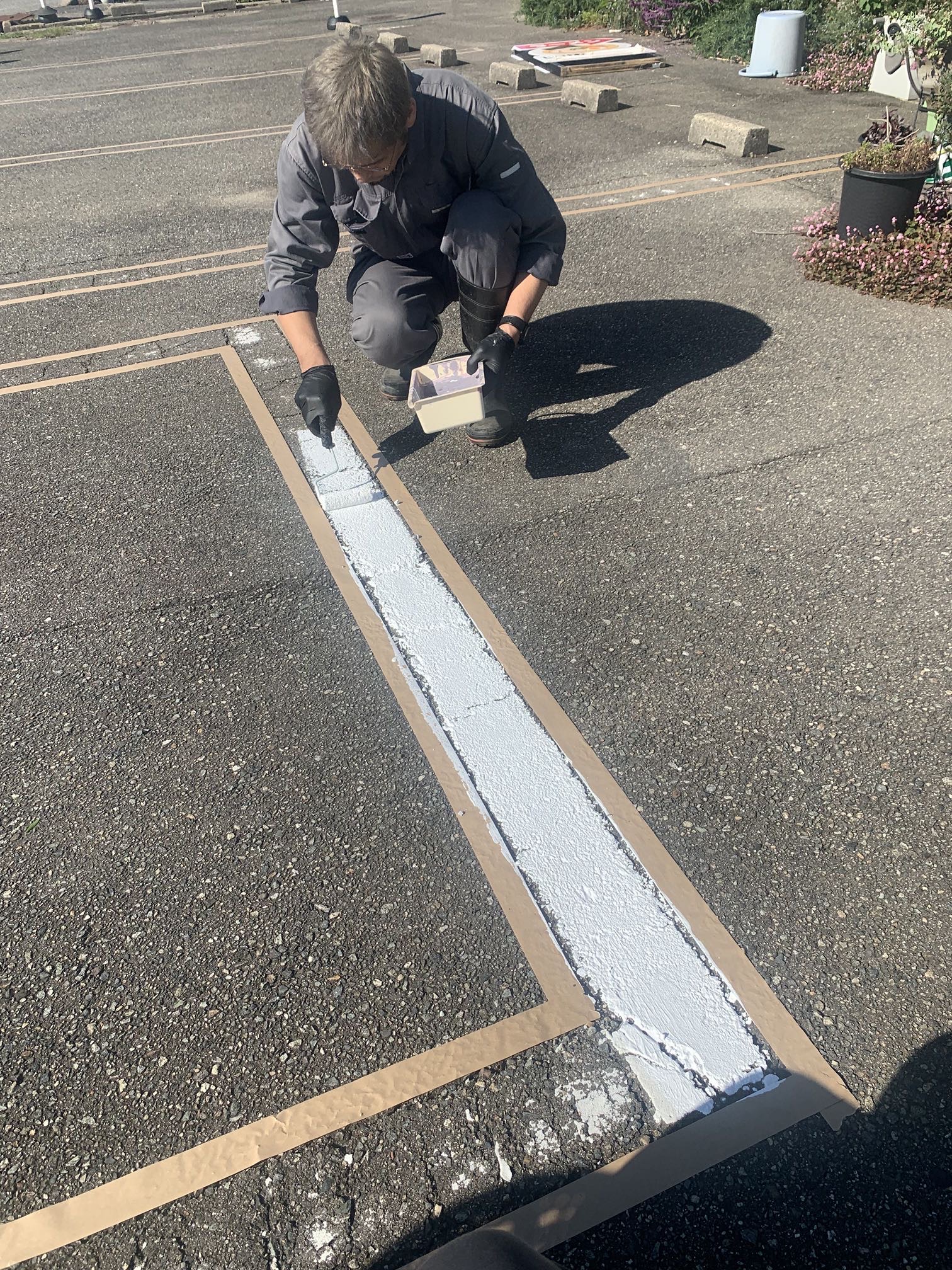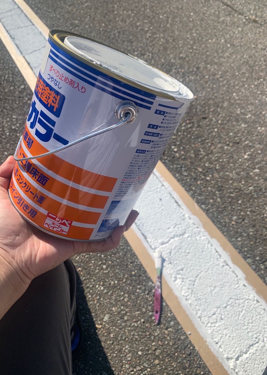 そこに、駐車場の線引き用のペイントを塗っていきます