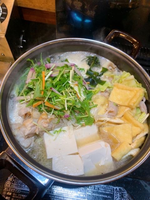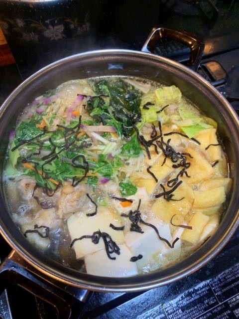 豆腐、キャベツ、ワカメ、揚げ、鶏肉、豚肉