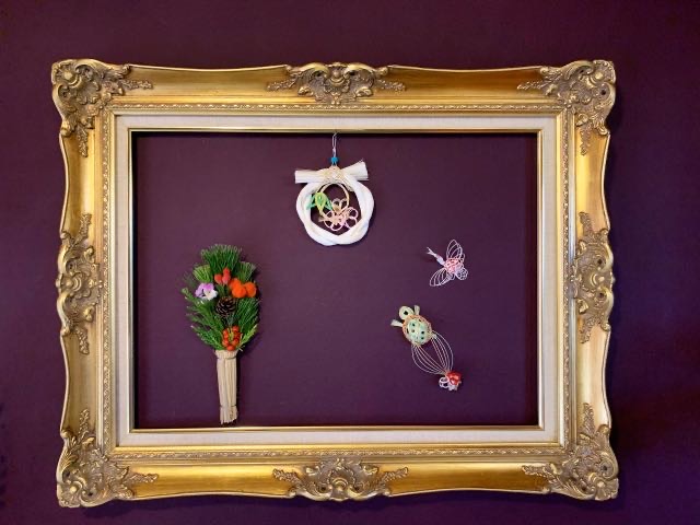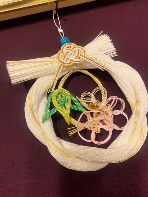 水引きで作ったしめ縄と、鶴亀を飾りました