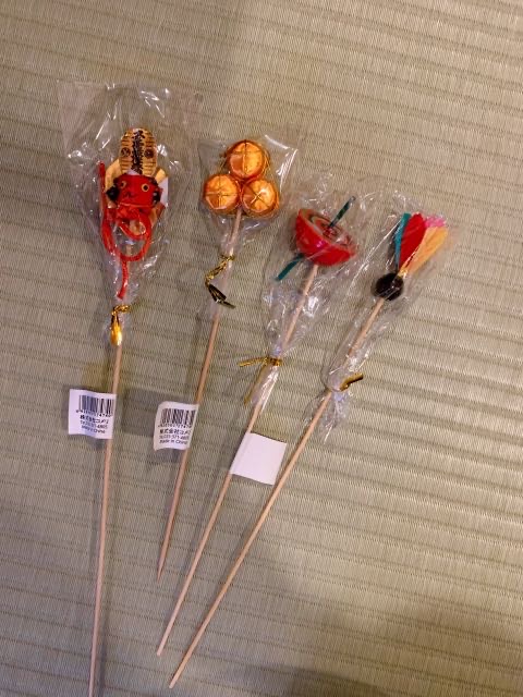 獅子舞、米俵、駒、羽子板の羽のかざりは