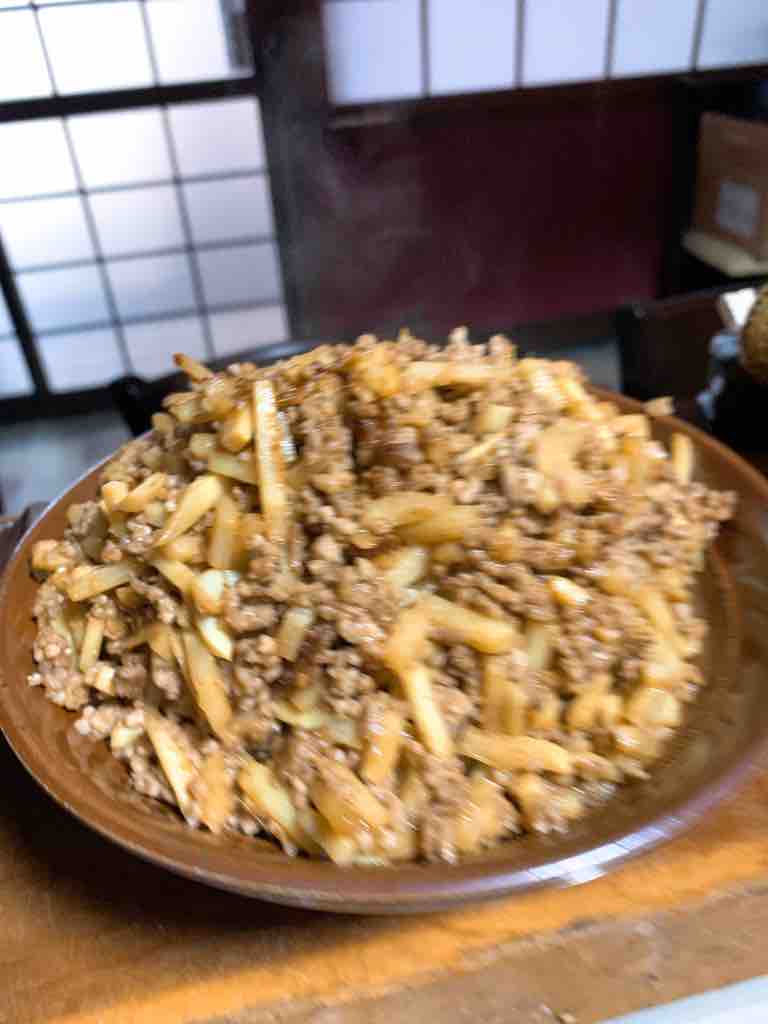 ミンチと筍を炒めて肉味噌を作り